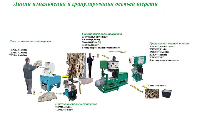 Линия гранулирования овечьей шерсти PLSW-50 Линия модульного типа. Производительность : 50 кг /час. Состав линии: 1.Измельчитель TLP3126(5,5кВт)-1 штука(7750 ЕВРО/4900 ЕВРО). 2.Пресс гранулятор BN100W(5,5 кВт) производительностью 50-60 кг/час -1 штука(12450 ЕВРО/8500 ЕВРО). 3.Система аспирации...