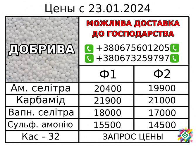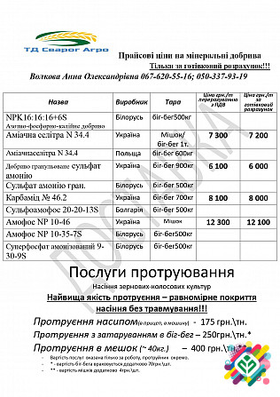 Добрива - Аміачна селітра (Черкаси, Сєвєродонецьк б-б) = 7000 грн/т - Карбамід (Черкаси) = 8600 грн/т - Карбамід (Дніпразотм) = 8600 грн/т - P 46 (Тройний суперфосфат, Болгарія б-б) = 13400 грн/т - NP 10:46 (Амофос, Казахстан м) = 15500 грн/т - NP 20:20+13S (Сульфоамофос, Болгарія б-б) = 11500 грн/...