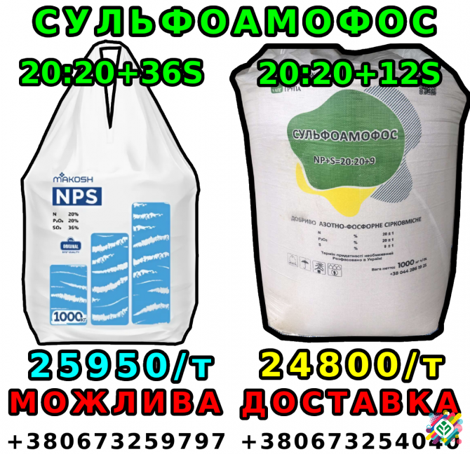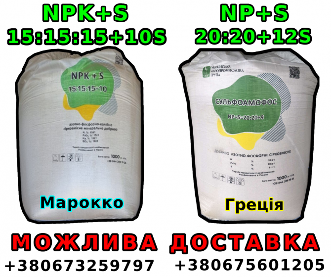 NP+S 20:20+12 (Греція, 1т) NPK+S 15:15:15+10S (Марокко, 1т) Карбамід (Туркменістан, 1т) Аміачна селітра (Туреччина, 1т) можлива доставка до господарства