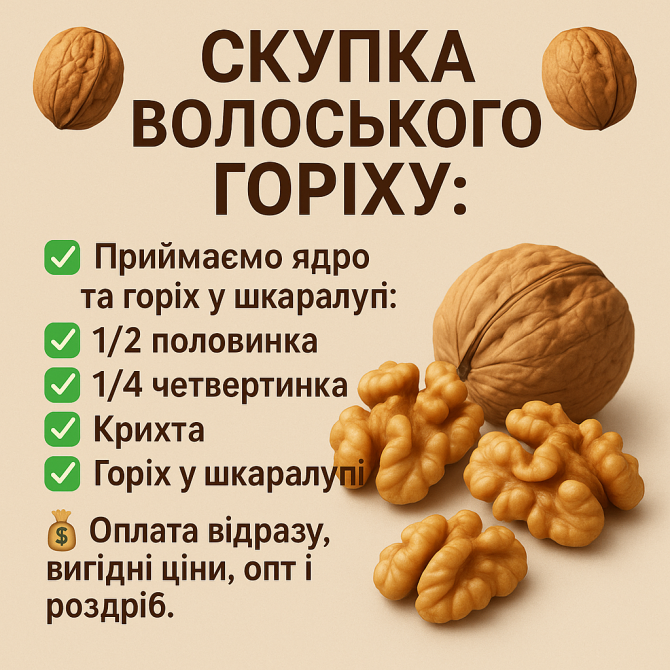 Купуємо волоський горіх! ???? У шкаралупі та очищений (1/2, 1/4, дроблений) ???? Гарантовано кращі ціни ???? ???? Швидкий розрахунок