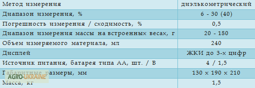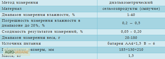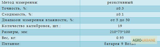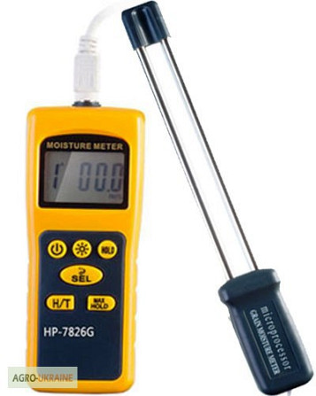 Пристрій призначений для оперативного вимірювання вологості зернових, бобових культур, насіння та продуктів їх переробки в умовах збирання, післязбиральної обробки, сушіння, зберігання та переробки. Волагомір дозволяє вимірювати вологість у 12 культурах, таких як: пшениця, ячмінь, кукурудза, соя, ра...