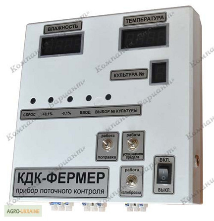 ЕКСПРЕС-АНАЛІЗАТОР ВОЛОГИ "КДК – ФЕРМЕР" Експрес-аналізатор вологи "КДК – ФЕРМЕР" розроблений для використання у потоці під час сушіння кукурудзи, зернових та олійних культур в сушарках шахтного та іншого типу; застосування на комбікормових заводах, млинах та зберігальних спорудах для контролю пото...