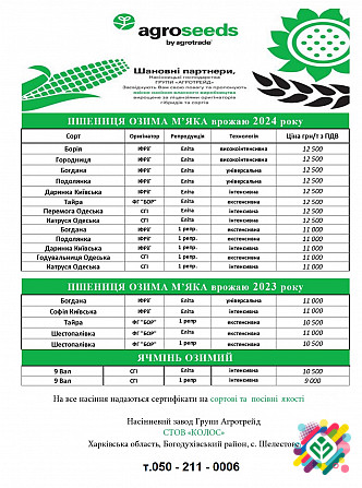 Пропонуємо вам придбати сертифіковане насіння пшениці еліти та перші репродукції відомих сортів. Наше насіння походить від сучасного насіннєвого заводу імені Фадєєва, що гарантує його високу якість та відповідність стандартам. У нашому асортименті ви знайдете 14 видів насіння пшениці, серед яких: -...