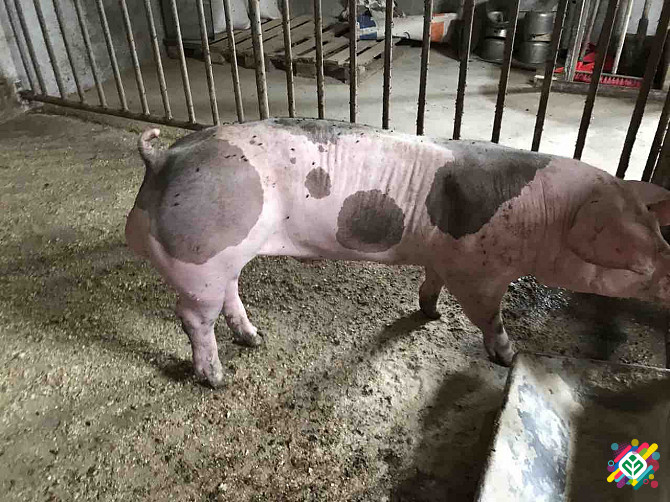 **Племінний молодняк свиней з високою репродуктивною продуктивністю** У продукції зазначено племінний молодняк свиней з різних порід: Кантор, Дюрок, Ландрас, Макстер. Ці породи свиней відомі своєю високою репродуктивною якістю та швидким приростом ваги. Кожна свиня має вагу від 100 до 130 кг, що св...
