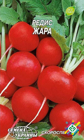 Мінімальна кількість для замовлення - 10 штук. Редька сорту "Жара" є скороспілим. Вегетаційний період від сходів до технічної спелості триває 18-25 днів. Коренеплоди мають округлу форму, гладку текстуру та малиново-червоний колір, вагою 25-30 грам, з відмінним смаковим профілем. М'якоть є білою, сок...