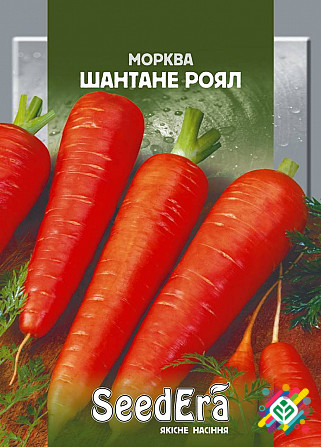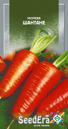 Мінімальна кількість для замовлення: 10 штук. Морква «Шантане» є середньораннім та високоврожайним сортом. Коренеплід має ущільнено-конічну форму з тупим кінцем, довжина становить 14-15 см, діаметр – 5-5,6 см, маса до 250 г. М'якоть та серцевина моркви мають оранжево-червоний колір, є щільними, сол...