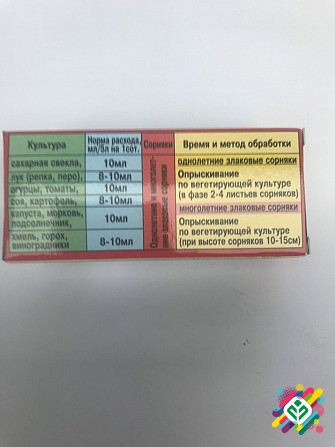 Селективний системний гербіцид, призначений для боротьби з бур'янами після сходів. Застосування: цукрова свекла, столова свекла, КОРМОВІ КУЛЬТУРИ, МОРКВА, соняшник, капуста білокачанна СЕРЕДНІХ І пізніх сортів, цибуля всіх генерацій. Шкідливі бур'яни: мишак, пальчатка, куряче просо, овсуг, резина,...