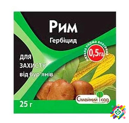 Мінімальна сума замовлення - 350 грн. Гербіцид Рим - после всходівий гербіцид системного дії для боротьби з однорічними та багаторічними злаковими та двосім'яними бур'янами в посівах картоплі, посівах кукурудзи на зерно, силос, зелений корм. Діюча речовина: римсульфурон 250 г/кг. Механізм дії: римсу...