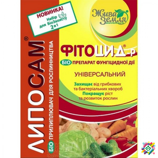 Набір складається з: - Біологічного фунгіциду ФІТОЦИД-Р (15 мл) - на основі живих клітин та спор природної бактерії Bacillus subtilis у кількості (1-9)*10^9 КОЕ/см3, з наявністю в складі природних мікро- та макроелементів, біологічно активних продуктів життєдіяльності бактерій: ферментів, вітамінів...