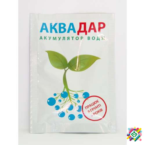 Це вологопоглинач, що вводиться в ґрунт або матеріали, абсорбує та зберігає великі кількості води та поживних речовин. На відміну від більшості продуктів, які поглинають воду, Аквадар має властивість легкої віддачі абсорбованої води та поживних речовин, надаючи їх рослинам. Ця функція називається ци...