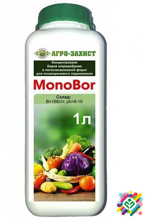 MonoBor (В) - це концентрований борний мікродобриво у легкоасимільованій формі для позакореневого підживлення. Склад: Бор (В) = 168 г / л, pH = 8-10. Бор бере участь у формуванні структури клітинних стінок та синтезі нуклеїнових кислот. Рослини потребують бору для нормального функціонування точок...