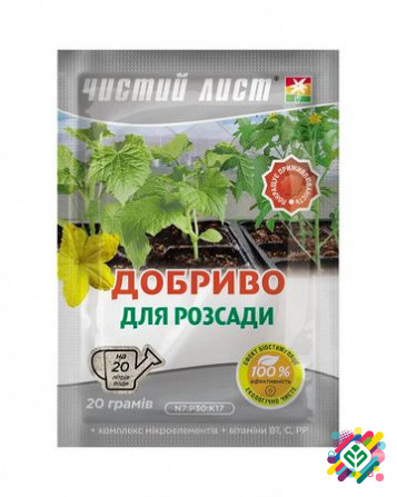 Чистий лист - кристалічне добриво для розсади, упаковка 20 г, що містить високоефективні, концентровані, мінеральні компоненти в доступних формах для всебічного живлення рослин. Переваги: - Покращує приживленість та швидкий ріст молодих рослин. - Зміцнює життєздатність рослин, сприяє високій якості...