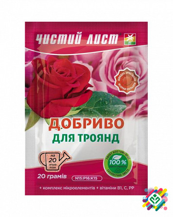 "Чистый Лист" - кристалічне добриво для троянд, упаковка 20 г, яке є високоефективним, концентрованим, мінеральним добривом, що містить всі необхідні для живлення рослин елементи у доступних формах. Переваги: - Підсилює яскравість квіткових відтінків. - Забезпечує повноцінне і тривале цвітіння. - С...