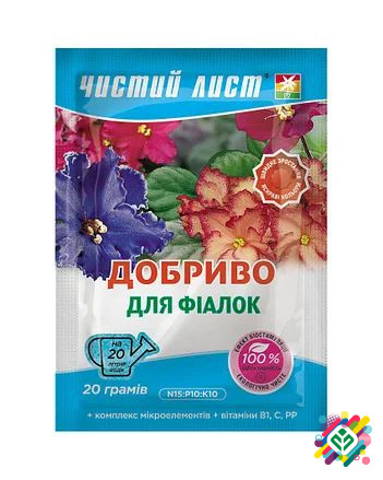 Чистий лист - кристалічне добриво для фіалок, упаковка 20 г, є високоефективним, концентрованим, мінеральним добривом, що містить всі необхідні для живлення рослини елементи у доступних формах. Переваги: - Забезпечує рослини повноцінним, неперервним живленням, зміцнює кореневу систему рослин. - Стим...
