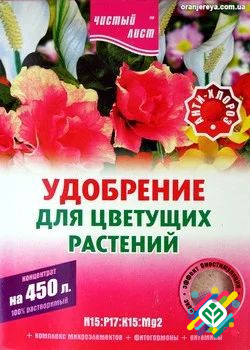 "Чистий лист" - кристалічне добриво для цвітучих рослин (300 г) - високоефективне, концентроване, мінеральне добриво, що містить всі необхідні для живлення рослин елементи у доступних формах. Переваги: - Підсилює яскравість квіткових відтінків. - Забезпечує повноцінне і тривале цвітіння. - Сприяє у...