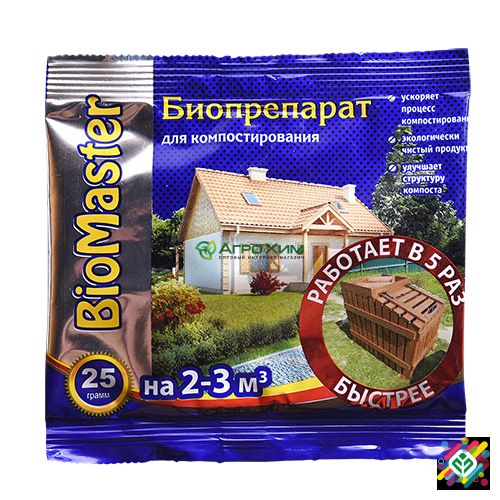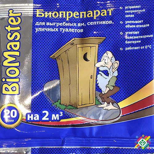 **Біомастер**: біопрепарат з комплексом ефективних мікроорганізмів та ферментів для прискорення переробки органічних відходів (фекалій, їстівних та органічних відходів). Призначений для переробки фекальних відходів у воду, вуглекислий газ та невелику кількість осаду. Забезпечення чистоти в дачному ...