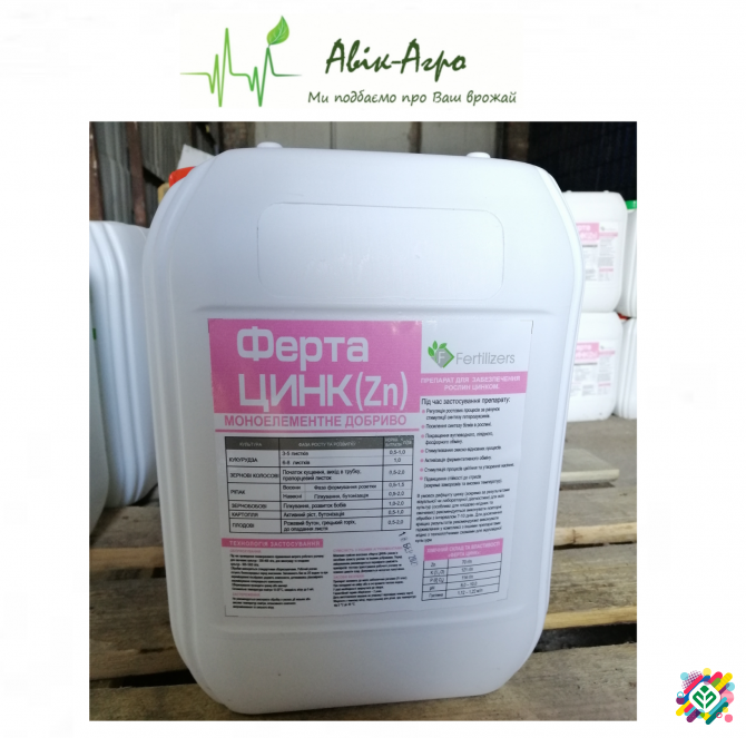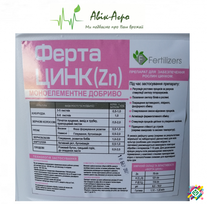 10л - 1120 грн В НАЯВНОСТІ **Моноелементне добриво Ферта Цинк (Zn)** - препарат для забезпечення рослин цинком. **Під час застосування препарату:** - Регуляція ростових процесів за рахунок стимуляції синтезу гетероауксинів - Посилення синтезу білків в рослині - Покращення вуглеводного, ліпідного,...