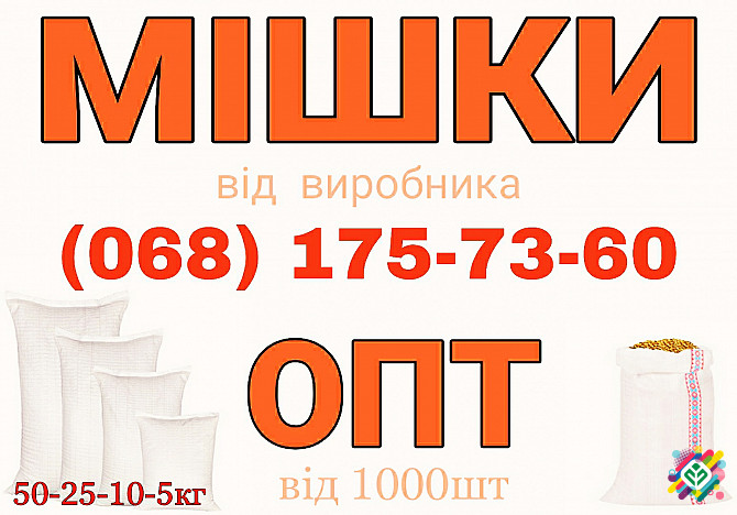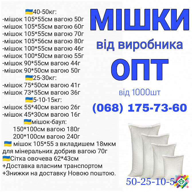 Представляємо вашій увазі поліпропіленові мішки від виробника, доступні тільки оптом. Наш асортимент включає мішки вагою 5, 10, 25 та 50 кг, а також мішки-баули розмірами 150*100 см і 200*100 см, з ПЕТ вкладкою, а також овочеву сітку. Ми пропонуємо доставку Новою Поштою або самовивіз, а також можлив...