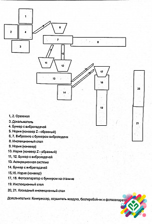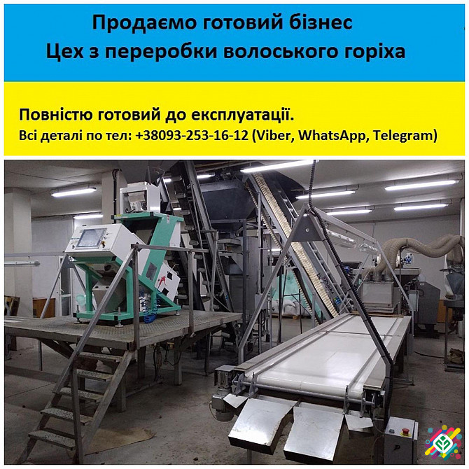 Продається готовий бізнес — Лінія з переробки волоського горіха, повністю готова до експлуатації. Усе обладнання знаходиться в хорошому робочому стані. Лінія включає в себе наступне обладнання: горіхоколи, доколювальник, вібросито, бункери, норії, інспекційні столи, аспіраційну систему, фотосепарато...
