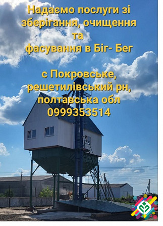 **Технічний опис послуг зі зберігання, перевалки, очищення та фасування зерна у біг-беги** У селі Покровське, що знаходиться в Полтавській області, в районі Решетилівському, надається широкий спектр послуг з обробки зерна. Компанія спеціалізується на зберіганні, перевалці, очищенні та фасуванні зер...