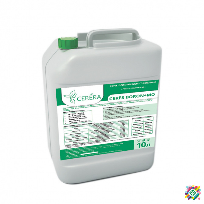 Високоефективний розчин бору+молібдену (B+Mo) в доступній для рослин формі боретаноламіна, в комплексі з органічними кислотами. Хімічний склад і властивості: - N – 3,6% (46 г/л) - B – 9,3% (120 г/л) - Mo – 0,46% (6 г/л) - Органічні кислоти - РН – 7,0-8,0 - Густина – 1,23-1,28 г/л Основні переваги ...