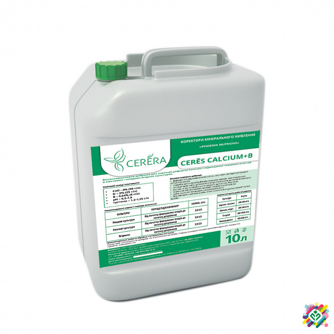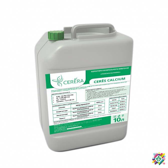 Високоефективне добриво для корекції дефіциту кальцію і підвищення товарних якостей в овочевих і плодово-ягідних культурах. **Хімічний склад і властивості:** Найменування: Cerēs CALCIUM Склад: - CaO – 12,7% (172 г/л) - N – 7,3% (99 г/л) - рН – 5,5-6,5 - Густина – 1,30-1,36 г/л **Основні переваги д...