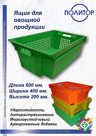 **Технічний Опис Пластикових Ящиків для Овочів від "ПОЛИТОР"** Компанія "ПОЛИТОР", спеціалізуючись на виробництві тари та упаковки, пропонує великі пластикові ящики для овочів власного виробництва. Ці ящики виготовлені з ударостійкого поліетилену низького тиску, що забезпечує високу міцність та дов...