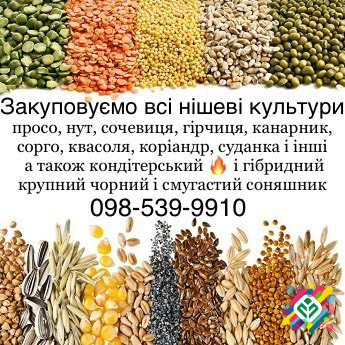 Придбання всіх нішевих культур! Кондитерський соняшник (а також крупногабаритний чорний і смугастий гібридний соняшник), просо, нут, сочевиця, канарник, гірчиця, квасоля, сорго, льон, насіння гарбуза, коріандр, росторопша, овес, зелений горох, гречка, сафлор, віка, суданка, люцерна, тверда пшениця,...