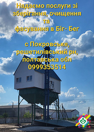 **Технічний опис послуг зі зберігання, перевалки, очищення та фасування зерна у біг-беги** У селі Покровське, що знаходиться в Полтавській області, в районі Решетилівському, надається широкий спектр послуг з обробки зерна. Компанія спеціалізується на зберіганні, перевалці, очищенні та фасуванні зер...