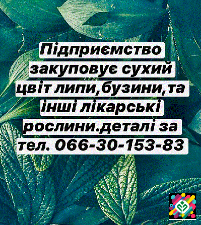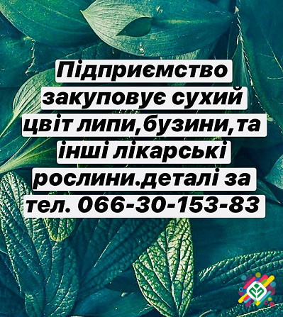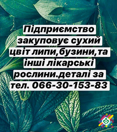 На постійній основі підприємство здійснює закупівлю лікарських рослин, серед яких цвіт липи, цвіт бузини та інші. Розташування пункту прийому лікарських рослин — місто Лубни, Полтавська область. Для отримання додаткової інформації та узгодження деталей звертайтеся за телефоном: 0663015383 Артем. *...