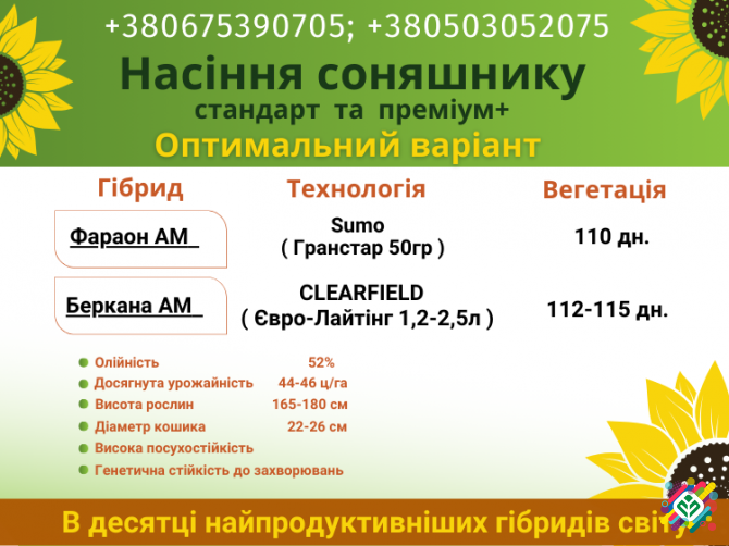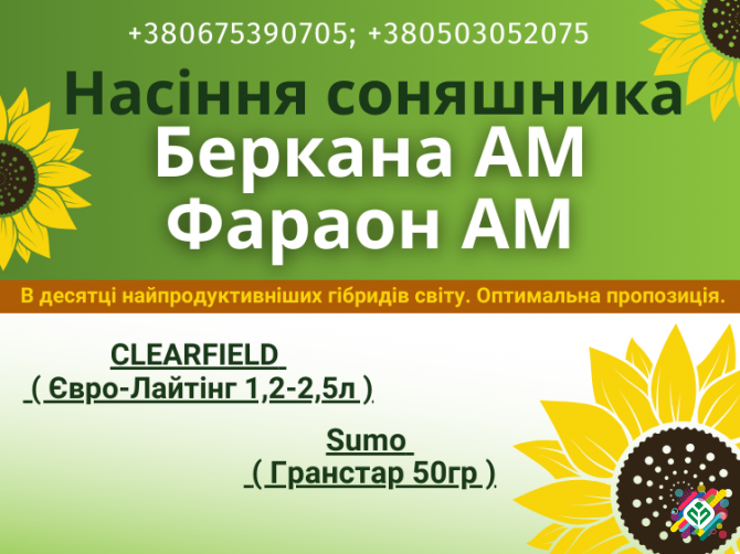 **Опис продукту: Соняшникове насіння від сортів Фараон АМ та Беркана АМ з технологією SUMO або CLEARFIELD** У нашому асортименті Ви знайдете ранньостиглі гібриди соняшника - Фараон АМ та Беркана АМ, які відрізняються оптимальною ціною та високою якістю насіння. Вони вирощуються під контролем технол...