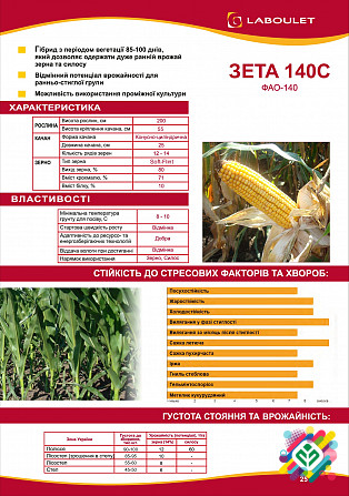 Гібрид кукурудзи ZETA 140C Лабуле є силосним ультра-раннеспелим гібридом. Цей гібрид відзначається високою врожайністю та стійкістю до стресових умов. Технічні характеристики: - Група стиглості: ультра-ранній; - Країна походження: Франція; - Кількість насінин у мішку: 80 000 посівних одиниць; - Об...