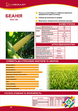 Гібрид кукурудзи BEANIA FAO 160 Лабуле є раннеспілим гібридом, відомим своєю високою врожайністю та стабільністю у різних кліматичних умовах. Семена цього гібриду вирощені та оброблені в оригінальній лабораторії у Франції. Кожен мішок містить 80000 насінин, що забезпечує широкі можливості для посіву...