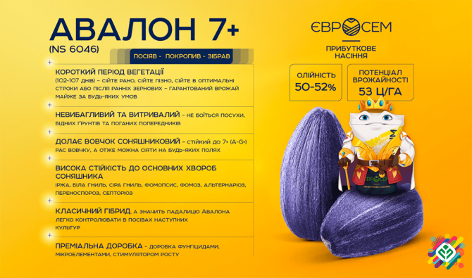 **Технічний опис гібриду соняшника "НС Авалон (НС 6046)"** Насіння соняшника гібриду "НС Авалон (НС 6046)" є продуктом селекції здійсненої в Сербії (NS SEME - Інститут рільництва М. Нові Сад). Цей гібрид відноситься до класичної технології та характеризується чорним кольором насіння. Вирощування ць...