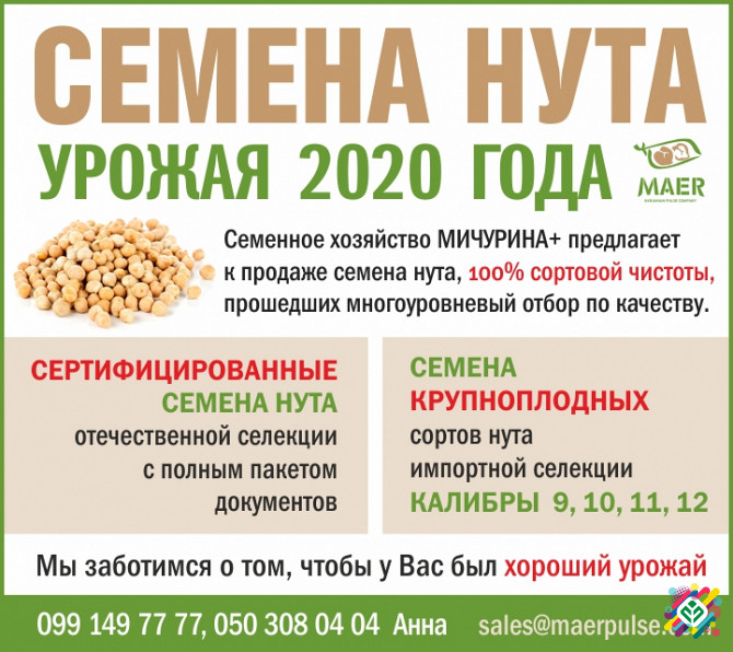 Науково-технічний опис продукції «Насіннєве господарство Мічуріна+»: «Насіннєве господарство Мічуріна+» є провідним виробником насіння нуту в Україні. Наш асортимент включає насіння нуту української та іноземної селекції, включаючи великоплідний сорт з калібром 9+. Усі наші продукти посвідчені відп...