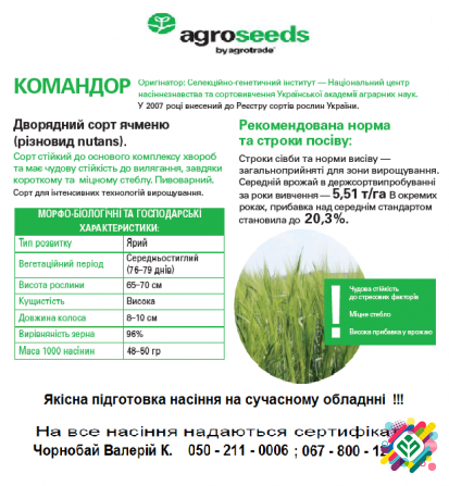 **Насіння ячменю Геліос І** Насіння ячменю Геліос І є продуктом високої якості, який відзначається стійкістю до стресових умов та високим врожаєм. Ця сортова одиниця є результатом довгого відбору та селекції, що гарантує стійкий ріст та високу продуктивність. **Технічна інформація:** - **Група сти...