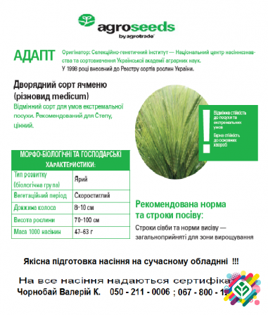 Пропонуємо придбати насіння ячменю від заводу-виробника "Агроексперт-Трейд". У нас в наявності продовольчий та кормовий сорти ячменю: "Буффало 102", "Себастьян" для пивоваріння та "Вакула" для корму тварин. Високопродуктивний яровий сорт "Буффало-102" має урожайність до 81 ц/га. Він стійкий до посу...