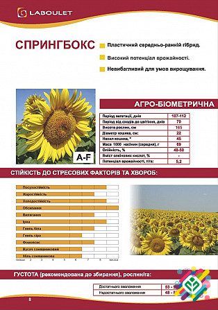 **Опис гібриду соняшнику "Спрингбок"** **Загальні характеристики:** "Спрингбок" є класичним сортом гібридного соняшнику, відноситься до середньоранніх гібридів та є простим у розведенні. **Агробіометричні характеристики:** - Період вегетації: 107-112 днів - Період від сходів до цвітіння: 70 днів -...