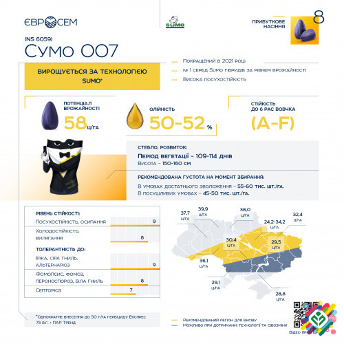 Насіння соняшника Сумо 007 (NS 6059) є гібридом, спеціально розробленим для використання в технології Гранстар (Експрес, Сумо). Цей гібрид був створений сербським Інститутом рільництва і овочівництва НС Семе. Гібрид Сумо 007 має вражаючий потенціал врожайності в середньому 58 центнерів на гектар. П...