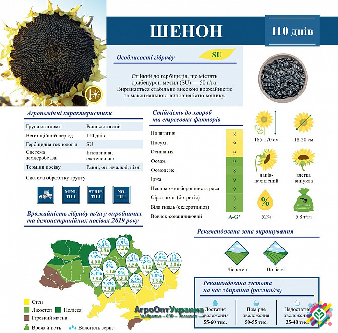 Гібрид соняшнику Шенон є стійким до гербіцидів, які містять трибенурон-метил (SU) у концентрації 50 г/га. Цей гібрид належить до інтенсивного типу та відрізняється високою стійкістю до хвороб, посухи та нових рас вовчка. Він володіє великою стабільною урожайністю та максимальною виповненістю корзинк...