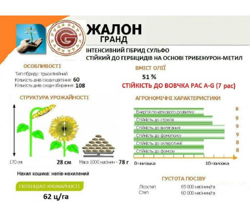 Соняшник Жалон Гранд F1 під Гранстар: Технічний Опис Соняшник Жалон Гранд F1 під Гранстар - це новинка 2017-18 року від ПП Агроспецпроекту та компанії Євралис Семанс. Цей гібрид соняшника відзначається високою стійкістю до вовчка сьомої раси A-G та до гербіцидів на основі трибенурон-метил. Технічн...