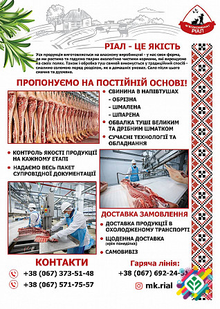 Компанія МК РІАЛ спеціалізується на постійному постачанні високоякісної свинини, яка представлена у різних формах для зручності клієнтів. Продукція включає в себе свинину в напівтушах (обрізну, шмалену, шпарену), а також обвалку туші у великих та дрібних шматках. Основні переваги продукції від МК РІ...