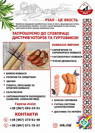 **МК РІАЛ: Якісні м'ясні вироби від виробника** МК РІАЛ радить співпрацювати з дистриб'юторами та гуртовиками, які цінують якість та безпеку продукції. Наш асортимент включає в себе сиров'ялені та сирокопчені ковбаси, напівкопчені ковбаси, м'ясні делікатеси, варені ковбаси, сосиски, сардельки, шинк...