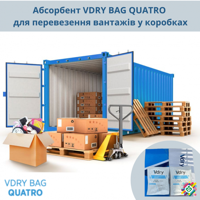 Абсорбент VDRY BAG QUATRO - це високоефективний десикант, який використовується для захисту вантажів від вологи під час транспортування. Він спеціально розроблений для експорту вантажів у коробках при контейнерних перевезеннях, що забезпечує надійний захист від конденсації та пошкоджень, викликаних ...