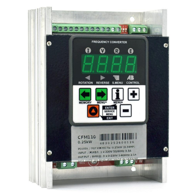 Опис Перетворювачі частоти серії CFM110 є втіленням принципів простоти, компактності, функціональності й економності в одному пристрої. Ця серія розрахована на електродвигуни малої потужності, а тому покликана позбавити привод загалом від надлишкових габаритів будь-якого з компонентів. Радіатор охо...