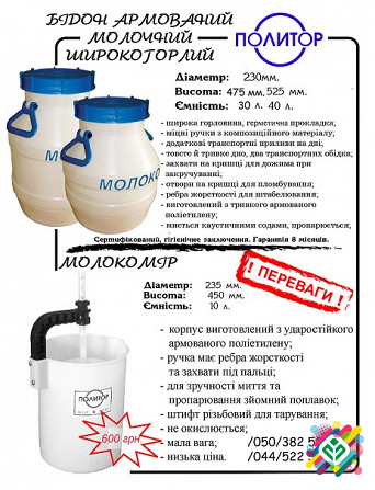 Пропонуємо придбати бідони для молока від виробника. Пластикові бідони для їжі мають міцний корпус, герметичне ущільнення та зручні ручки. Бідони виготовляються методом витяжного формування з поліетилену низького тиску. Матеріал поліетилен відрізняється високою міцністю та хімічною стійкістю. Пласт...
