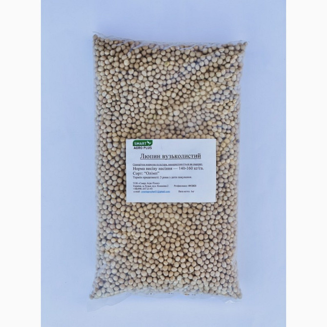 **Технічний опис продукту: Люпин** Люпин - це рослина, яка вирощується для використання як зелене добриво або зелений корм для тварин. Рекомендована норма висіву для отримання оптимальних результатів становить 120-160 кг на гектар або 1,2-1,6 кг на сотку. Чистота насіння становить 98,4%. Люпин най...