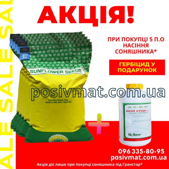 **Насіння соняшника толерантне до гранстару + гербіцид у подарунок** **Регіон:** вся Україна **Призначення зерна:** Посівний матеріал Придбайте посівний матеріал соняшника гібридів, що володіють толерантністю до гранстару, та отримайте у подарунок гербіцид у кількості 0,5 кг (трибенурон-метил 750...
