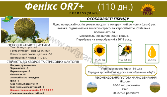 **ГІБРИД СОНЯШНИКА ФЕНІКС OR7: ІННОВАЦІЇ У ВИРОЩУВАННІ** **Виробник:** Науково-виробнича компанія "ГРАН" **Ціна:** - Стандарт (м.1000—59г.) – 3050 грн/п.о - Екстра (м.1000 – 65г.) – 3350 грн/п.о **ОСНОВНІ ХАРАКТЕРИСТИКИ:** - Гібрид соняшника для технології вирощування Експрес, Експрес Сан, SU...