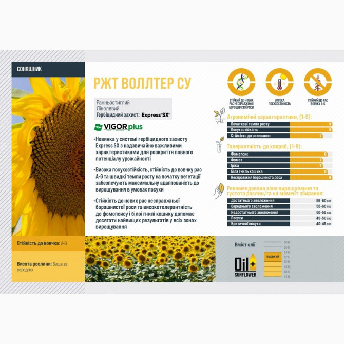 Соняшник РЖТ ВОЛЛТЕР СУ є новітнім гібридом соняшнику, спеціально створеним для використання у сільському господарстві. Цей гібрид відноситься до групи ранньостиглих сортів, які мають високу посухостійкість та володіють стійкістю до вовчку рас A-G. Однією з ключових переваг цього сорту є високі те...
